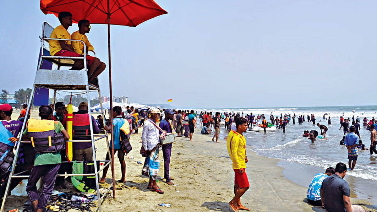 গত বুধবার বিকেলে সৈকতের সুগন্ধা পয়েন্ট পরিদর্শনের সময় দেখা যায়, ২০,০০০-এরও বেশি মানুষ সমুদ্রে স্নান করছেন। কয়েকজন লাইফগার্ড পর্যটকদের উঁচু চেয়ারে বসে, বালির উপর দাঁড়িয়ে, অথবা কোমর-গভীর জলে নিরাপত্তা দিচ্ছিলেন। যদি কোনও পর্যটক ঢেউয়ের কবলে পড়ে তাদের টিউব থেকে পড়ে যেত, তাহলে লাইফগার্ডরা তাৎক্ষণিকভাবে তাদের উদ্ধার করত।