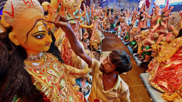 দুর্গাপূজা: প্রতিমার উপর চূড়ান্ত ছোঁয়া দিলেন কারিগররা