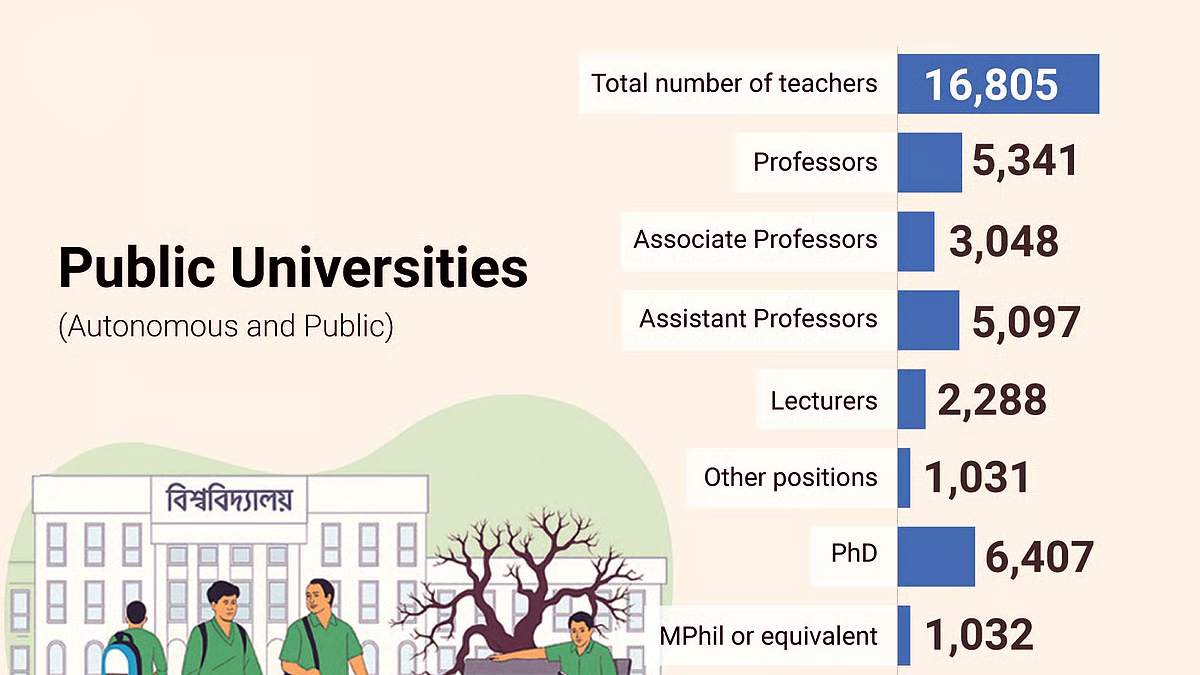 বাংলাদেশের পাবলিক বিশ্ববিদ্যালয়ের প্রায় ৫৬ শতাংশ শিক্ষকের উচ্চতর ডিগ্রি নেই। বাকিদের মধ্যে ৩৮ শতাংশের পিএইচডি ডিগ্রি এবং ৬ শতাংশের এমফিল বা সমমানের ডিগ্রি রয়েছে। ২০২৩ সালের তথ্যের ভিত্তিতে তৈরি বিশ্ববিদ্যালয় মঞ্জুরি কমিশনের (ইউজিসি) সর্বশেষ বার্ষিক প্রতিবেদন থেকে এই চিত্র উঠে এসেছে।